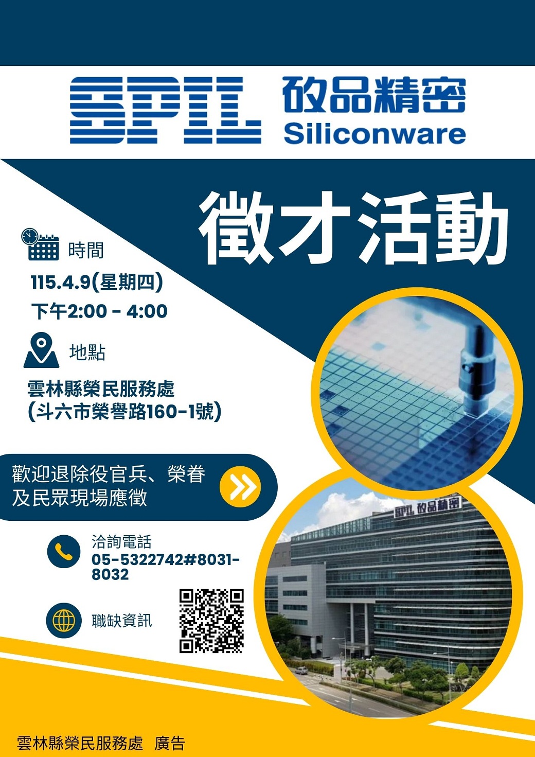 半導體封測大廠矽品精密公司擴大招募員工 歡迎有意願的退除役官兵及榮眷踴躍參加 也歡迎ㄧ般民眾踴躍應徵