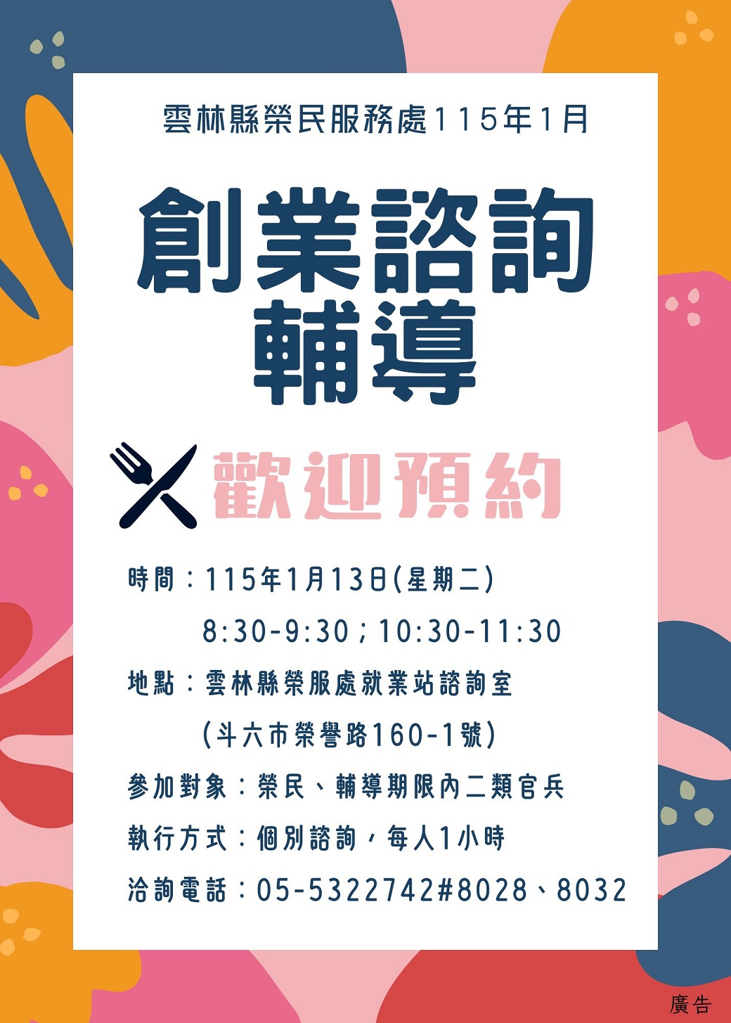 時間:115.1.13(星期二) 時段:8:30-9:30;10:30-11:30 (原則每人1小時) 地點:本處就業站諮詢室(斗六市榮譽路160-1號)