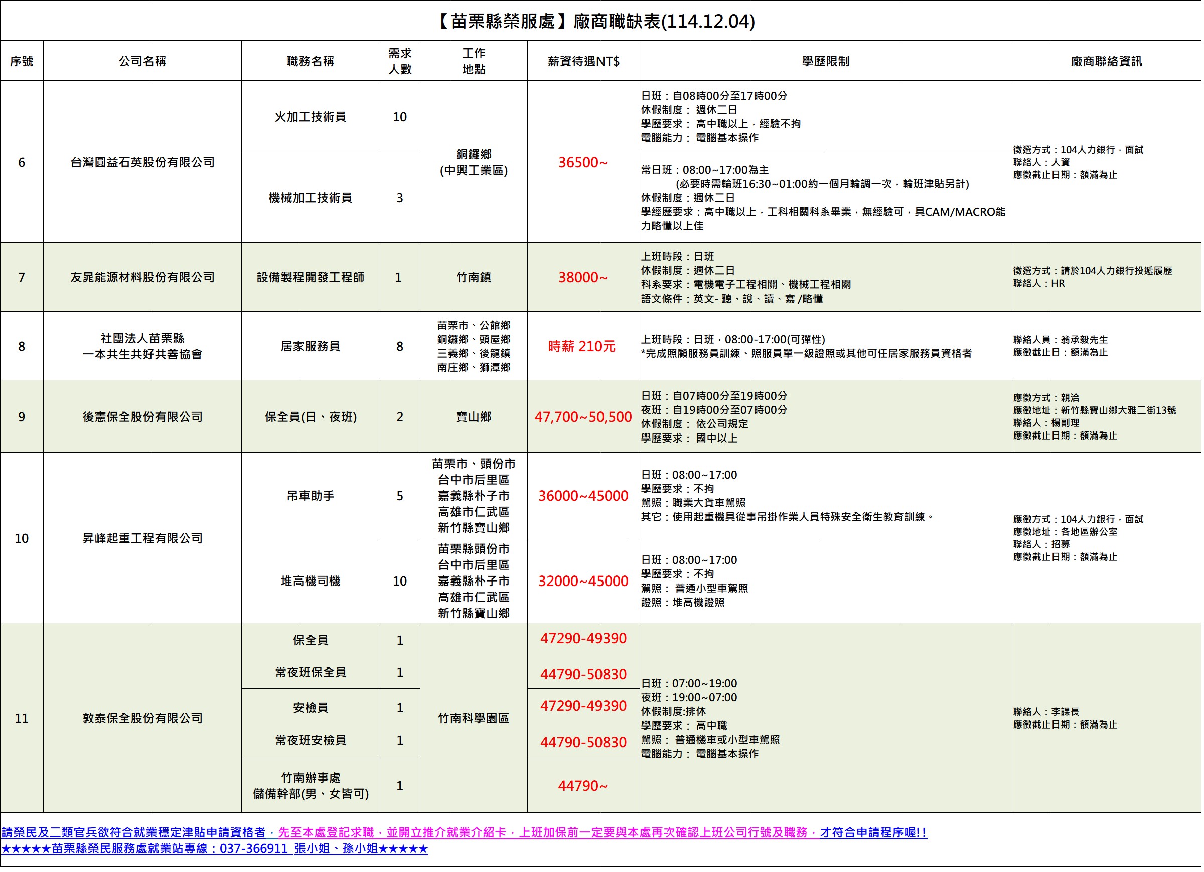 ★★★★★苗栗縣榮民服務處就業站專線:037-366911 張小姐、孫小姐★★★★★