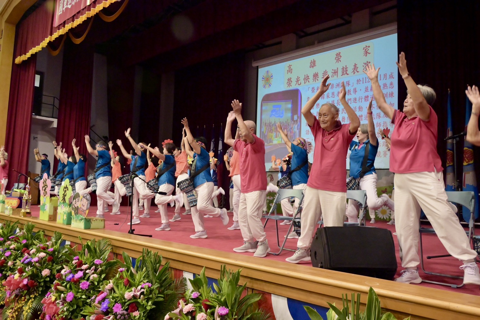主任委員特別表揚並嘉勉高雄榮家非洲鼓隊,恭禧他們榮獲衛福部國健署長者活躍老化「2025阿公阿嬤活力SHOW」競賽冠軍,而今天他們為了參加榮民節活動,不僅勤加練習,並組成旗舞隊、體適能隊及標語隊,透過緊鑼密鼓的團練,展現歡聚共融的氣氛。