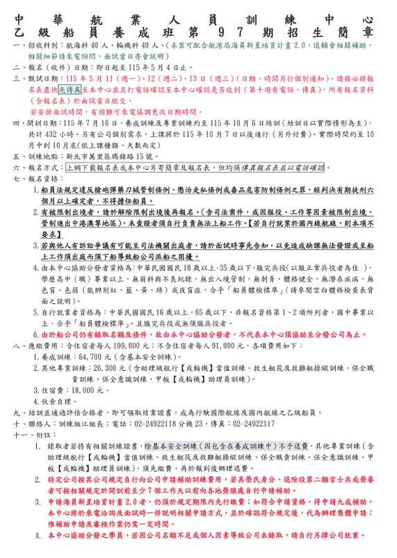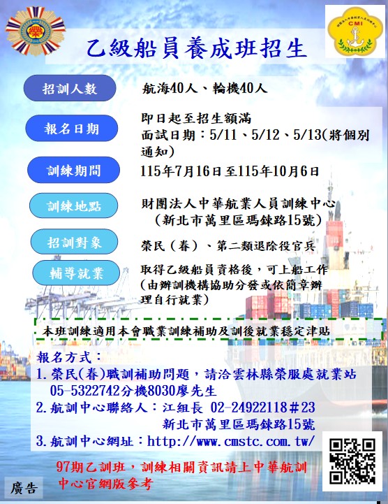 【職訓產訓專班】115年97期乙級船員養成班招生簡章